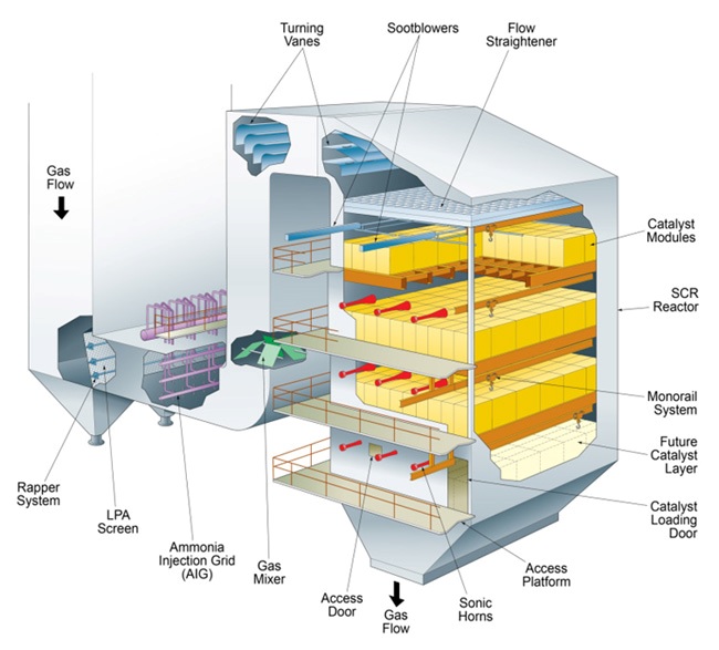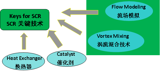 SCR系统设计的关键技术包括了流场模拟、催化剂的选择、涡流混合器(VGM)的技术、及热交器的选择(低尘布置)。 催化剂的选择直接决定了系统脱硝效率,反应器尺寸,运行温度,及氨逃逸率;根据SCR反应器在烟气系统中不同的布置位置,低尘布置时热交换器的选择也将成为降低系统运行成本的关键部件;而催化剂运行效率及运行寿命与催化剂上游烟气流动分布及还原剂与烟气混合均匀度有直接关系。